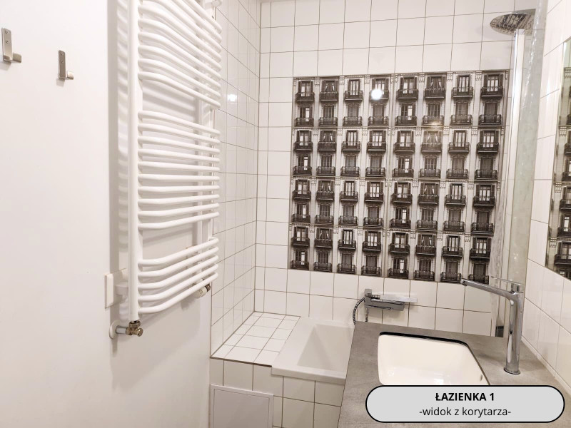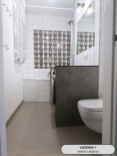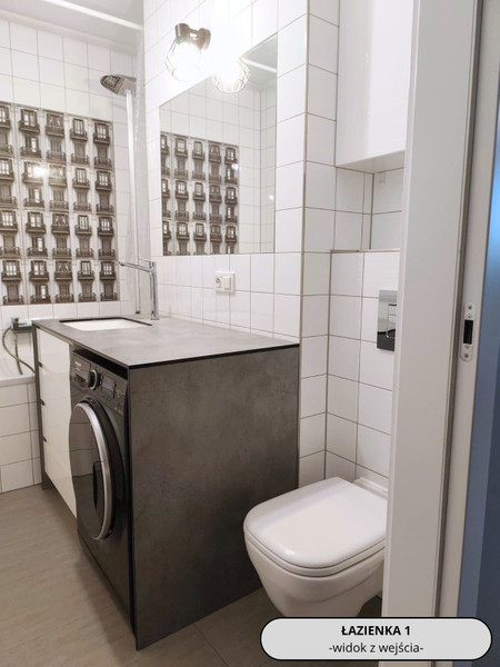 • Łazienka 1 ~ 4,5 m² - wanna z deszczownicą z sufitu, wc z zabudową powyżej, szafka pod umywalką z miejscem na pralkę
