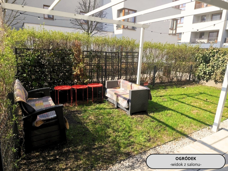 • Ogródek ~ 25,50 m² - ogrodzony średniowysokim ogrodzeniem panelowym, okolony żywopłotem o wysokości ok. 2 m, bezpieczny dla dzieci i zwierząt domowych