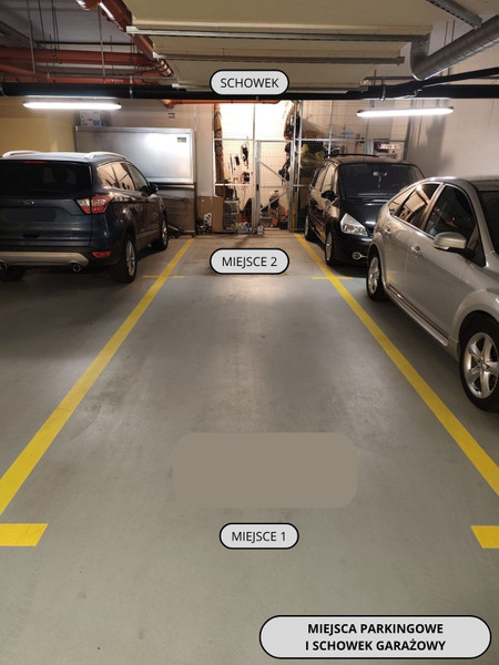 • Miejsce postojowe dwustanowiskowe (rodzinne – jedno auto za drugim) w garażu podziemnym + piwnica/schowek (za miejscami parkingowymi, zamykane na klucz, z własnym oświetleniem o powierzchni ok. 3 m²)