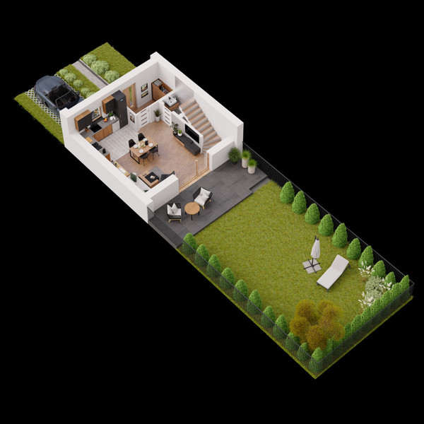 salon z aneksem kuchennym /wyjście na taras z ogrodem/, łazienka, przedsionek, klatka schodowa