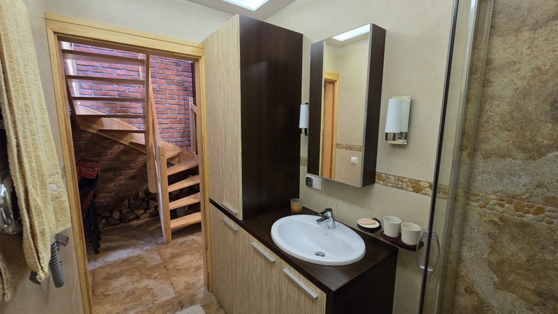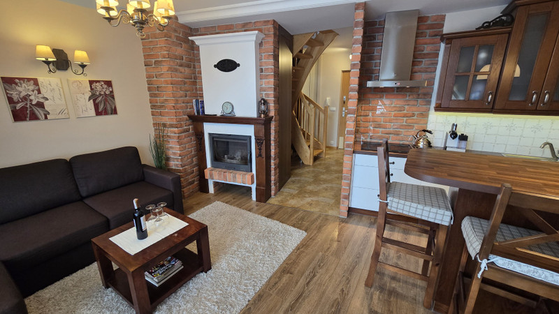 • Salon z kominkiem: Sercem apartamentu jest salon z wyjściem na balkon. Tradycyjny kominek tworzy niepowtarzalny, górski klimat, idealny na zimowe wieczory.