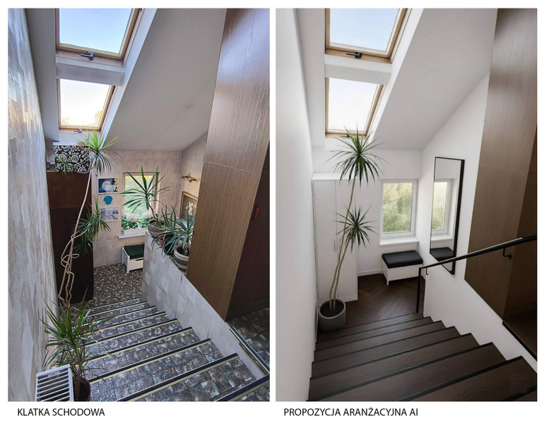 • Wysokość mieszkania: niestandardowa, sięgająca miejscami 5m (klatka schodowa) i ponad 4m (pokój na górze)