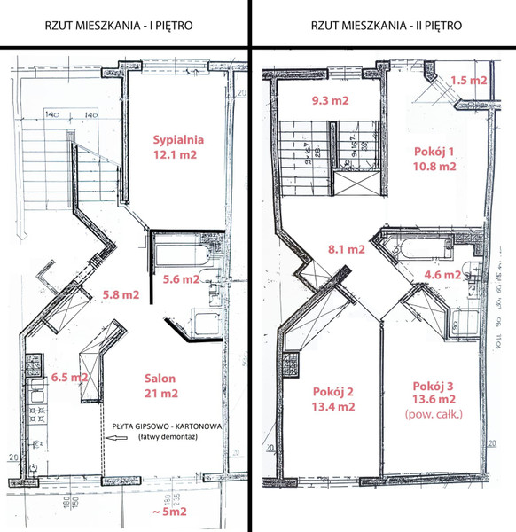 • Kondygnacja górna: 3 pokoje + łazienka + aneks kuchenny na piętrze (8.1 m2 w tym 2 szafy wnękowe) + przedpokój na półpiętrze (3.4 m2: 1.25m x 2.70m)