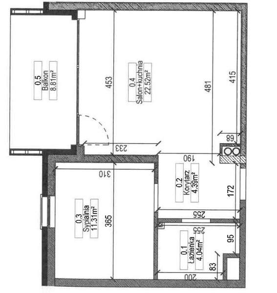 Układ: salon z aneksem kuchennym, sypialnia, łazienka, balkon 8 m².