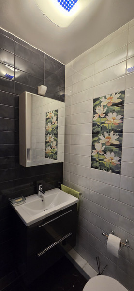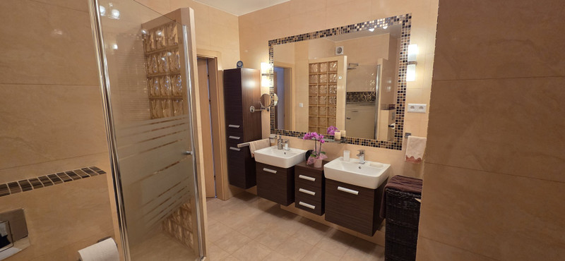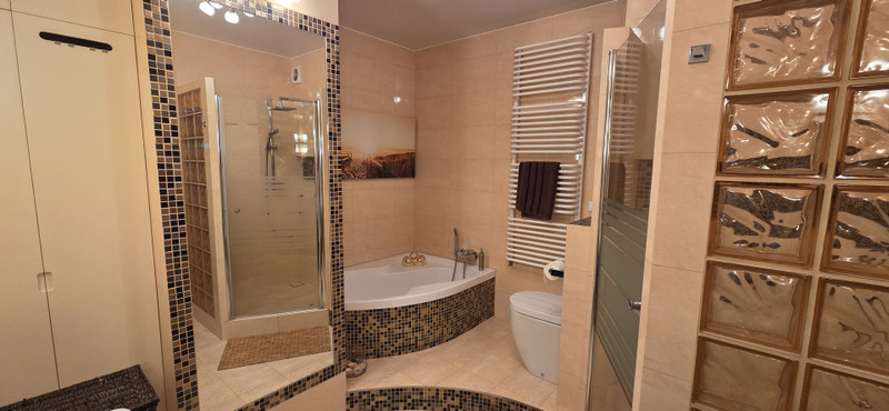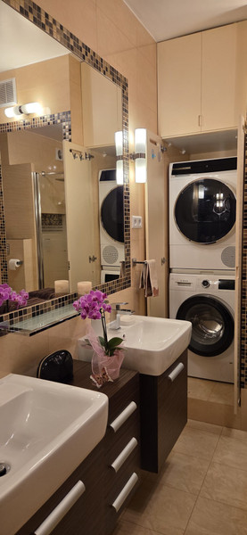 W mieszkaniu jest duża i wygodna łazienką z wanną oraz kabiną prysznicową i dwoma umywalkami i WC. Została tam wydzielona strefa mieszcząca pralkę i suszarkę do bielizny. W mieszkaniu znajduje się dodatkowe WC.