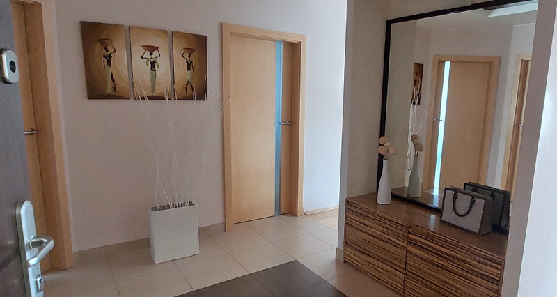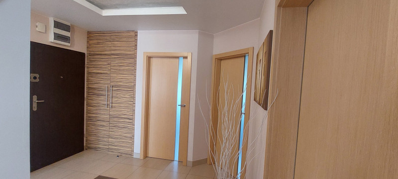 W przestronnym i jasnym hol/przedpokoju znajduje się szafa na ubrania wierzchnie i buty oraz komoda z dużym ściennym lustrem.