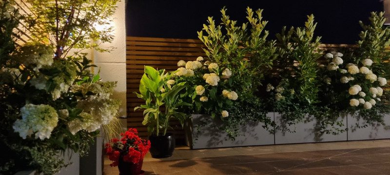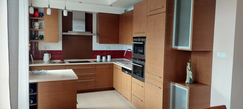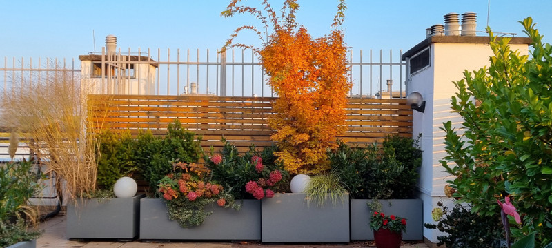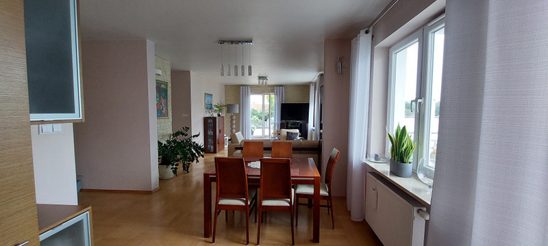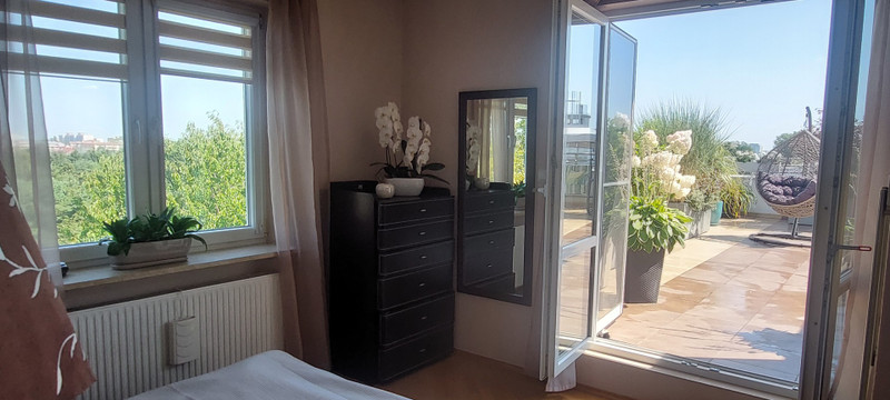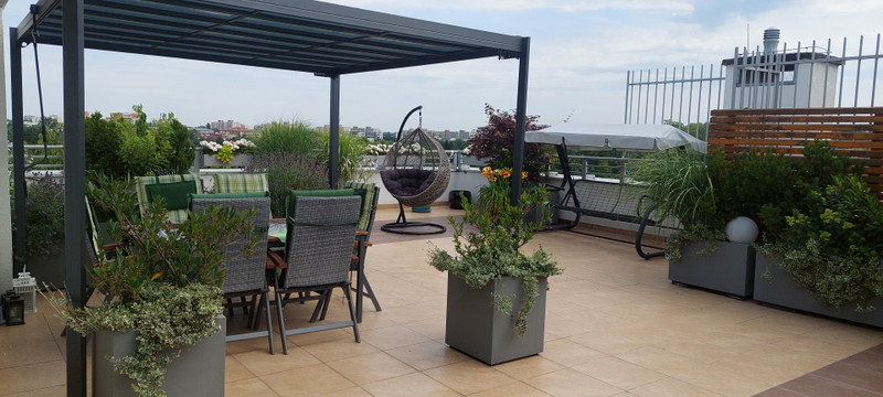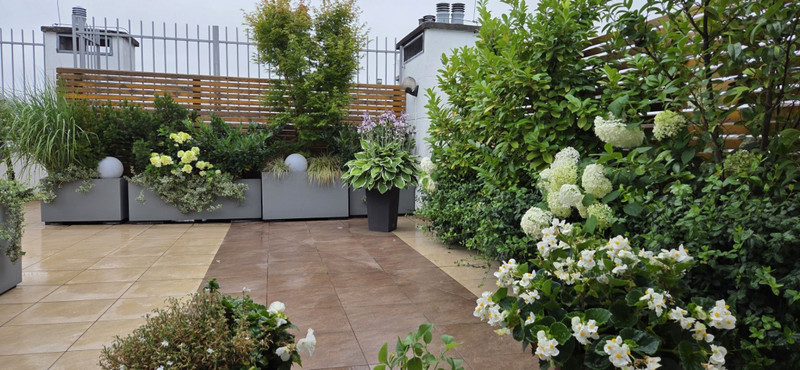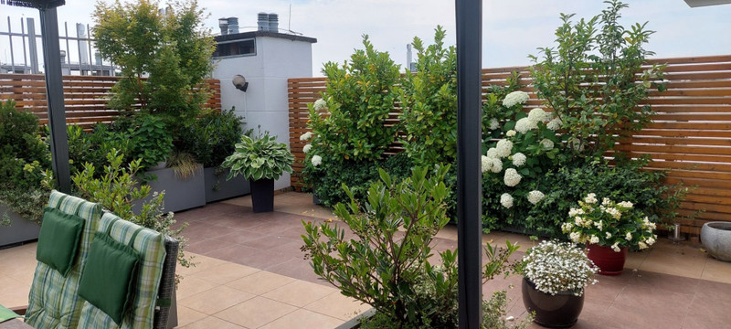 Główna sypialnia i salon mają wyjścia na duży zagospodarowany taras, który został urządzony z myślą o relaksie, odpoczynku i korzystaniu ze świeżego powietrza. Ogromną zaletą tarasu jest jego położenie, które zapewnia komfort odpoczynku w otoczeniu zieleni i osłonięcia od widoku osób trzecich. Taras znajduje się na poziomie mieszkania, nie trzeba wchodzić po schodach i ma regularną ustawną powierzchnię ok. 96 m2. Na tarasie zostały ustawione specjalne skrzynie i nasadzenia, głównie rośliny zimą zielone, latem kwitnące, taras posiada nastrojowe oświetlenie i nawodnienie kropelkowe roślin co pozwala z łatwością utrzymać ich dobry stan. Duże okna tarasowe posiadają elektrycznie sterowane żaluzje.