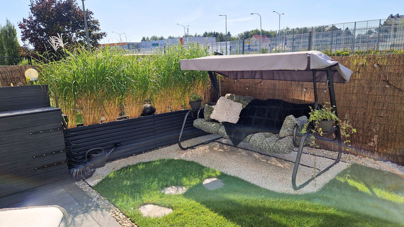 • ogród urządzony i dobrze osłonięty (panele wiklinowe, tuje, trawy ozdobne)