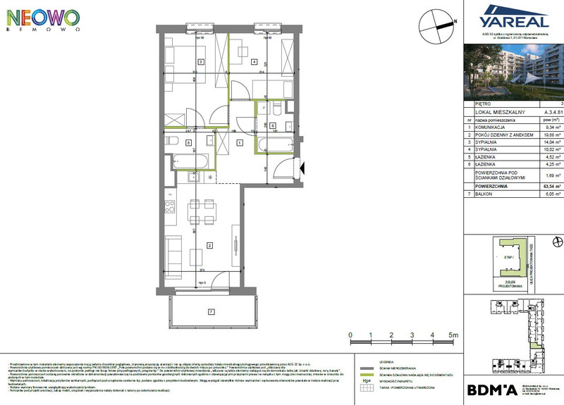 • Piętro: 3. / Pokoje 3 / Łazienki 2 / Aneks kuchenny 1 / Balkon 1