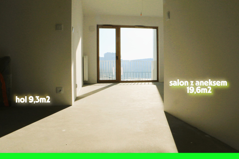 1. Jasny salon z aneksem kuchennym: 19,60 m² (wyjście na balkon).
