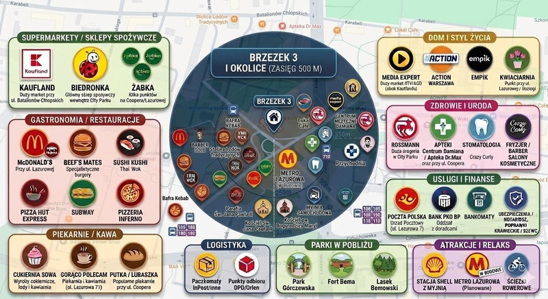 • Zakupy i Usługi: City Park, Biedronka, Kaufland, Lidl, Rossmann, liczne piekarnie i kawiarnie (7-10 min pieszo).