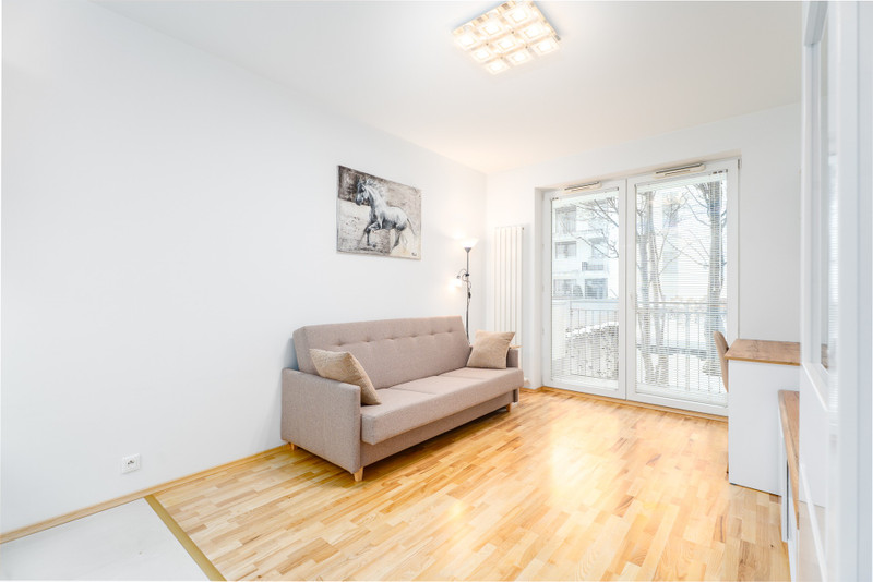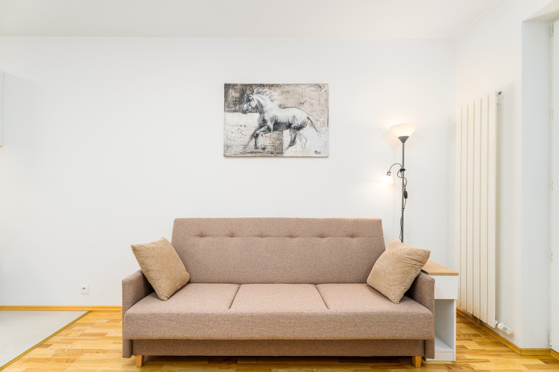 - w umeblowanym salonie wygodna wersalka, duże okno balkonowe;
