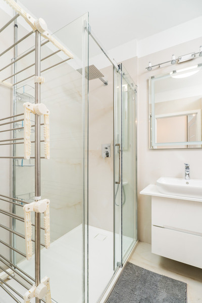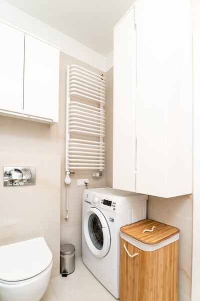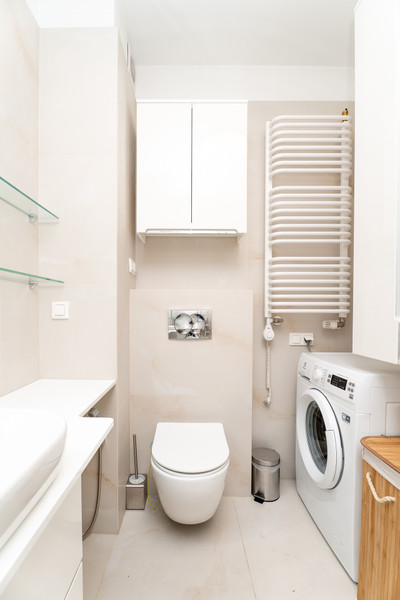 - w łazience prysznic z dużą kabiną, nowoczesne szafki ORISTO, duże lustro z podświetleniem, półki szklane, pralka;