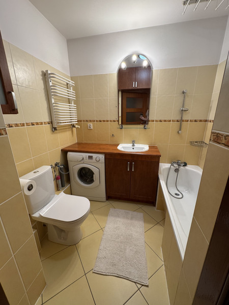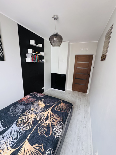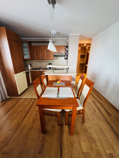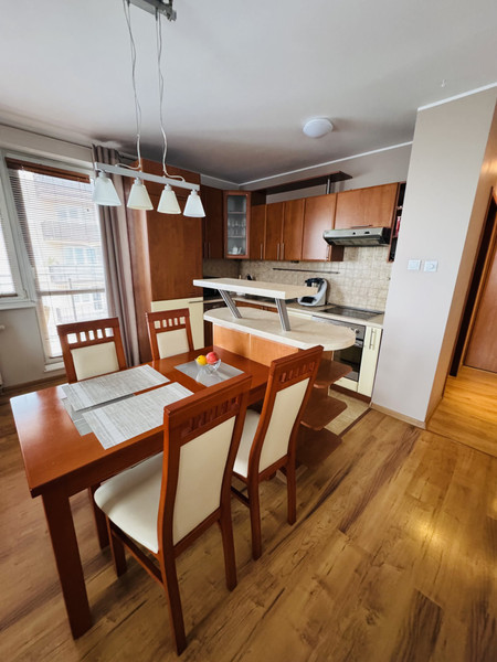 Cena obejmuje wyposażenie, tj.: zabudowę kuchni, sprzęt AGD, (lodówka, kuchnię indukcyjną, zmywarkę), stół, krzesła, narożnik, szafka RTV), w sypialni duże łóżko i szafa we wnęce i szafki. W przedpokoju bardzo pojemne szafy przesuwne.