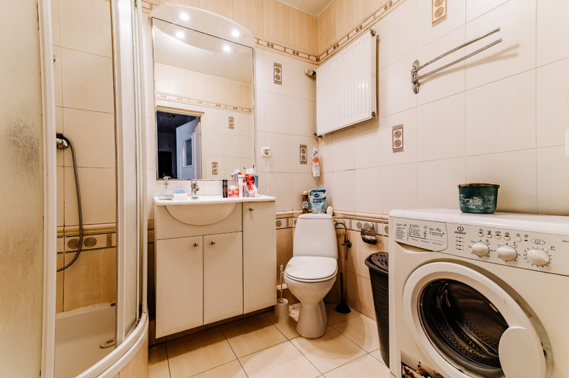 • Łazienki (4,10 m2) – kabina prysznicowa, na wyposażeniu pralka.