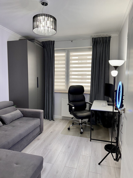 POKÓJ, który może być zarówno gabinetem jak i pokojem dziecięcym wyposażony w rozkładany narożnik z pojemnikiem na pościel, biurka, krzesła i duża przestronna szafa.