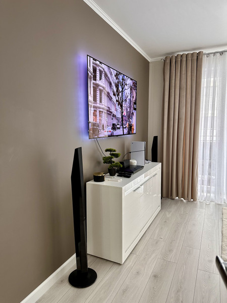 SALON składa się z szeroko otwieranych drzwi z wyjściem na taras, dużego narożnika z funkcją spania, komody, telewizora, oraz kino domowe.