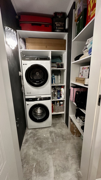 GARDEROBA, wyposażona w pralkę I suszarkę oraz przestronne półki po obu stronach.
