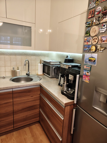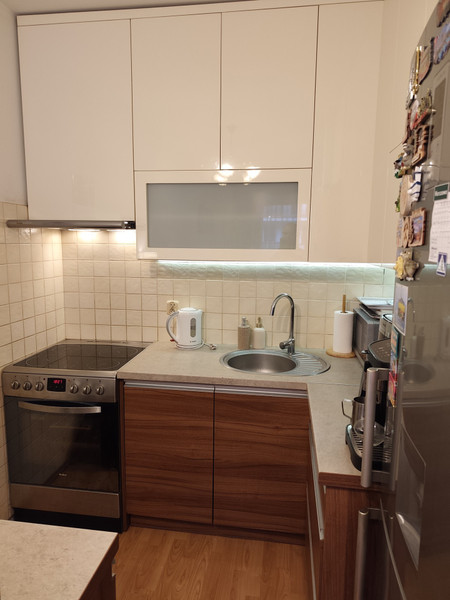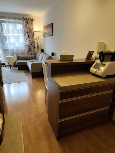 Salon połączony z otwartą kuchnią, w pełni wyposażoną (indukcja, piekarnik, zmywarka, lodówka). Kuchnia oddzielona od salonu za pomocą barku.
