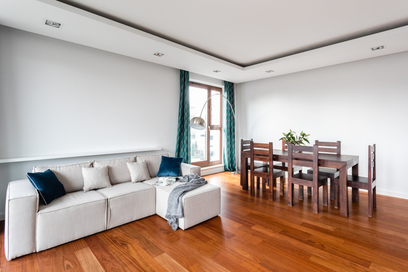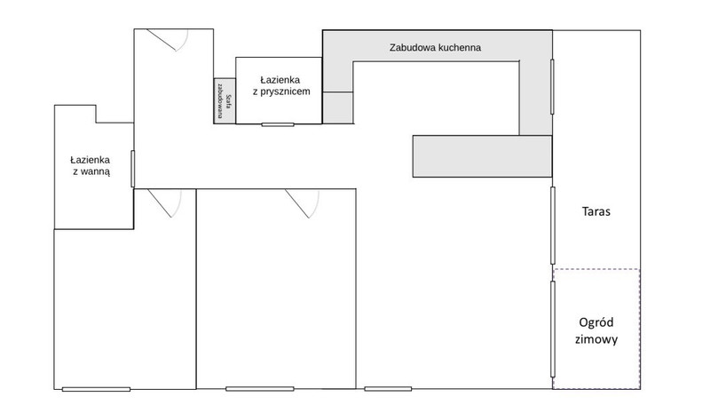 - salon z półwydzielonym aneksem kuchennym i wyjściem na balkon oraz ogród zimowy