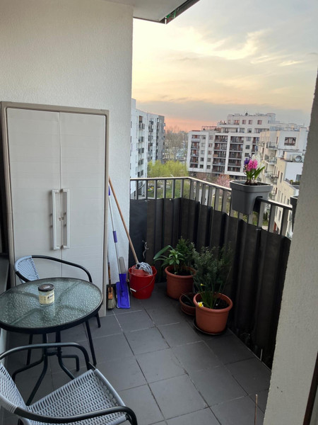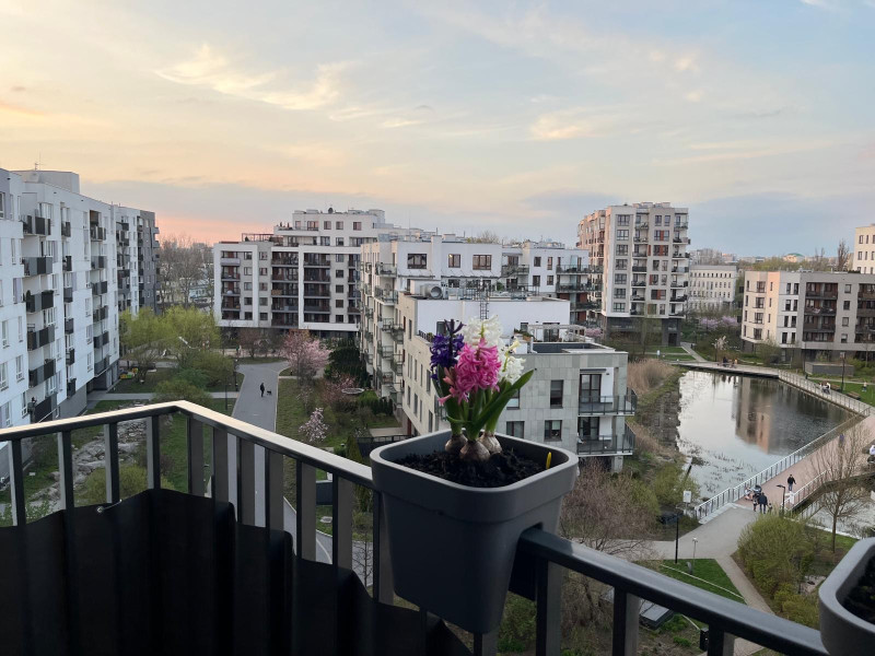 • Balkon wychodzący na osiedle z widokiem na dużo zieleni, oraz zbiornik wodny.