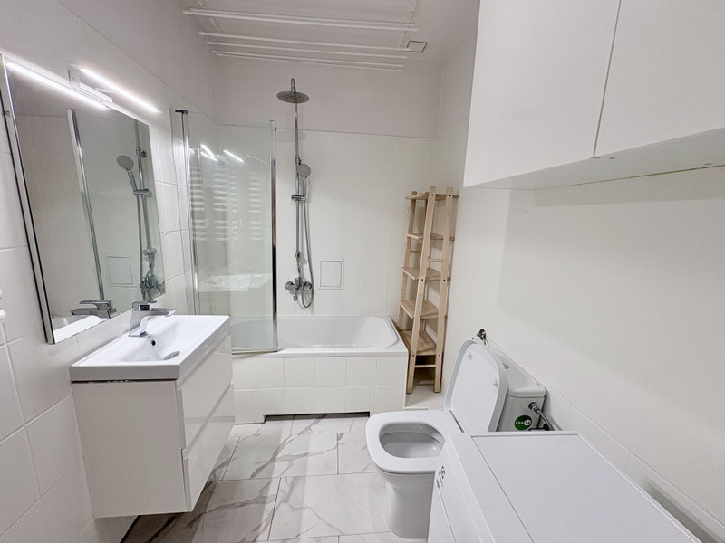 • Bathroom: Modern and ergonomic. Equipped with a bathtub with a rain shower and a glass screen, a washing machine, a wall-hung toilet, and built-in cabinets.