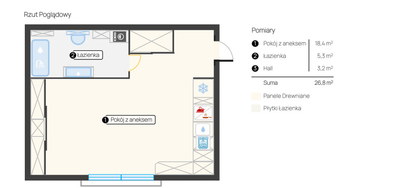 • Salon z sypialnią: Zaprojektowany do wypoczynku i pracy. Znajdziesz tu rozkładaną sofę ze specjalnym, wygodnym materacem do spania, dwa rodzaje oświetlenia oraz pojemną, 3-metrową szafę przesuwną.