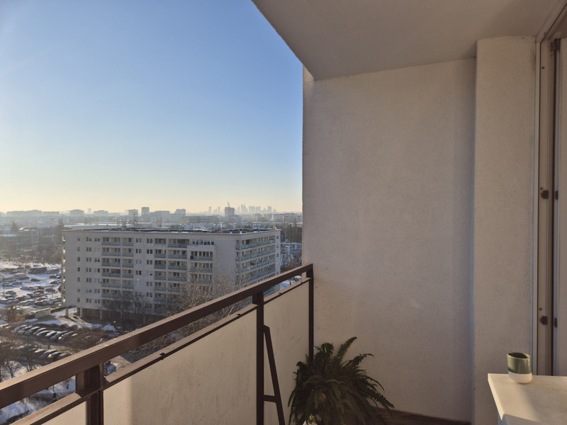 Otwarty balkon z przepięknym widokiem na centrum Warszawy.