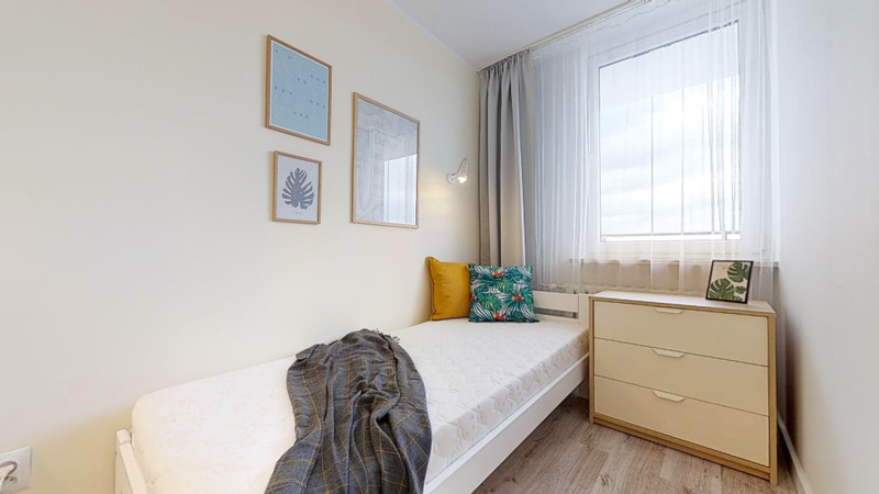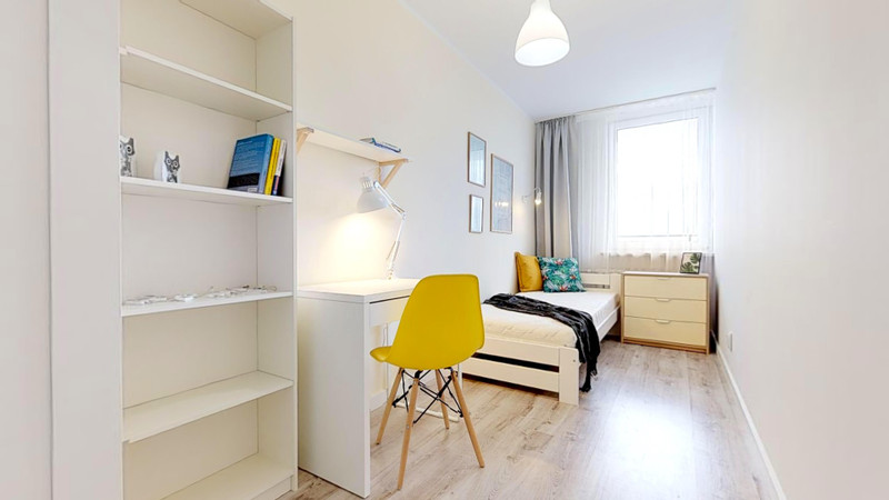 Mieszkanie ma 61,2 m², znajduje się na 11. piętrze trzynastopiętrowego budynku z dwiema windami. Układ obejmuje 5 jednoosobowych pokoi w tym jeden z balkonem, dużą kuchnię w przedpokoju i 2 pełne łazienki (z prysznicami i WC). Centralne ogrzewanie oraz ciepła i zimna woda pochodzą z miejskiej sieci. Lokal jest regularnie odświeżany (malowanie, wymiana zużytych elementów wyposażenia itd.) i sprzątany przez firmę sprzątającą.
