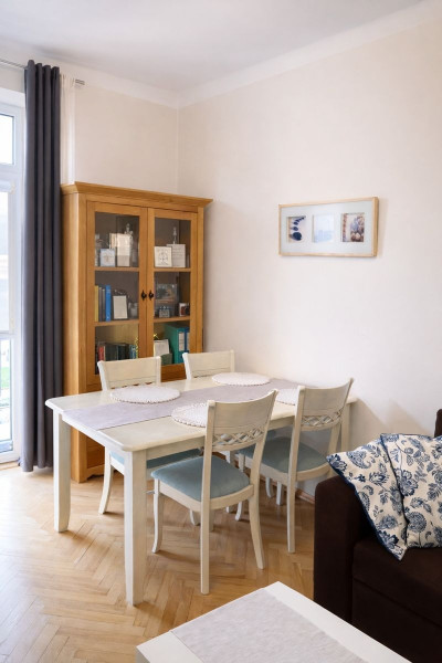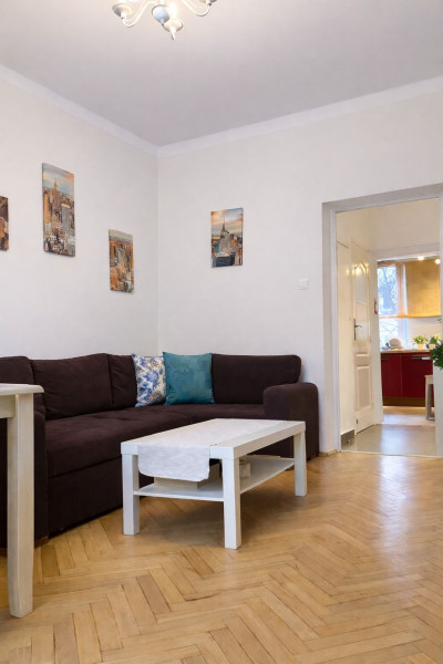 Dwa ustawne pokoje (17m2 oraz 14m2), każdy z niezależnym balkonikiem. Umeblowana kuchnia 7m2 z głębokimi blatami oraz oknem wychodzącym na patio oraz miejscem na stolik z 2 krzesłami.
