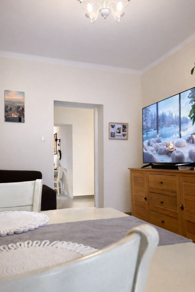 W pokojach na podłodze parkiet (do odświeżenia/miejscowej naprawy), w kuchni i przedpokoju płytki. Szafa wnękowa na wymiar w pokoju zachodnim. Łazienka z wanną w standardzie do remontu. Instalacja elektryczna do przeglądu i ew. modernizacji. W części pomieszczeń może być potrzebne odświeżenie malowania ścian. W przedpokoju szafa wnękowa.