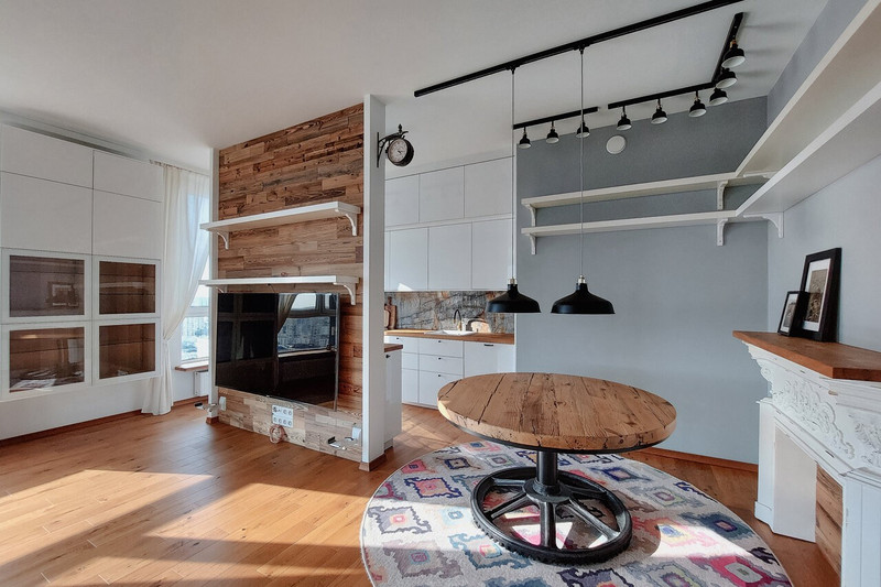 Apartament ma 100,64 m², a jego wnętrze łączy ciepły minimalizm z naturalnym wykończeniem: