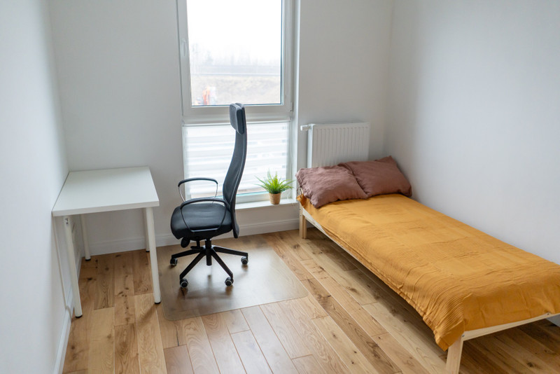 - Funkcjonalne meble: rozkładana kanapa, dwuosobowe i jednoosobowe łóżko, biurko z krzesłem, stół z krzesłami