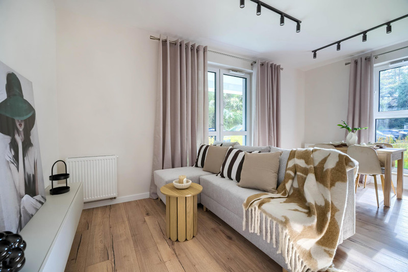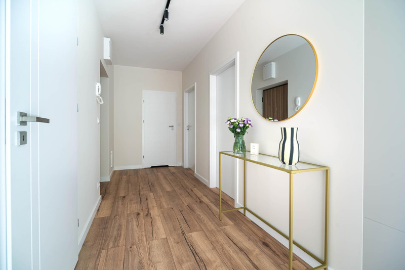 Mieszkanie wykończone w stylu nowoczesnym, w jasnych barwach, przy zachowaniu pełnego komfortu i funkcjonalności.