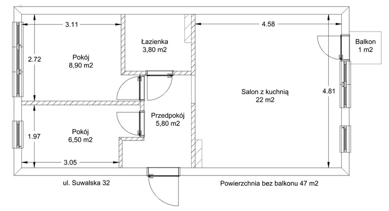 Na powierzchnię mieszkania 47 m2 składają się: