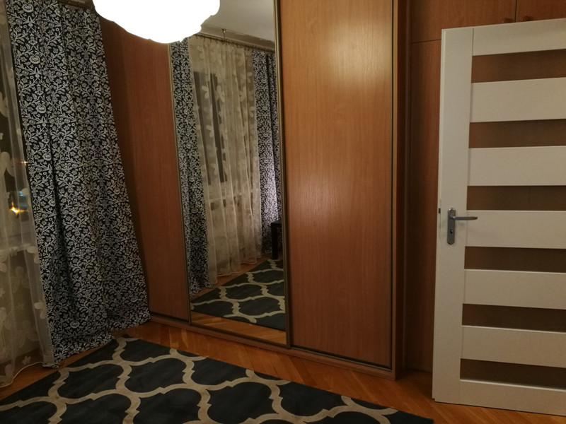 - Pokój z zabudową szafy w ścianie oraz łóżkiem a także dodatkowa szafa typu Komandor