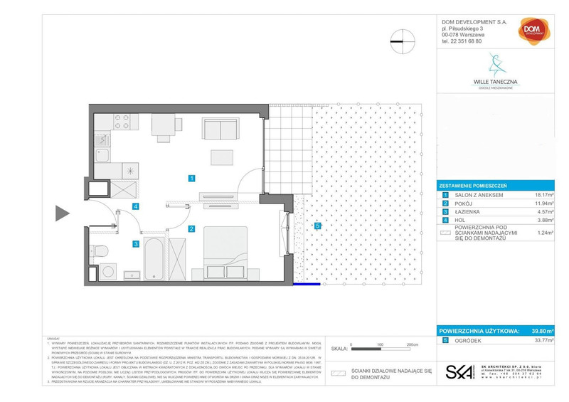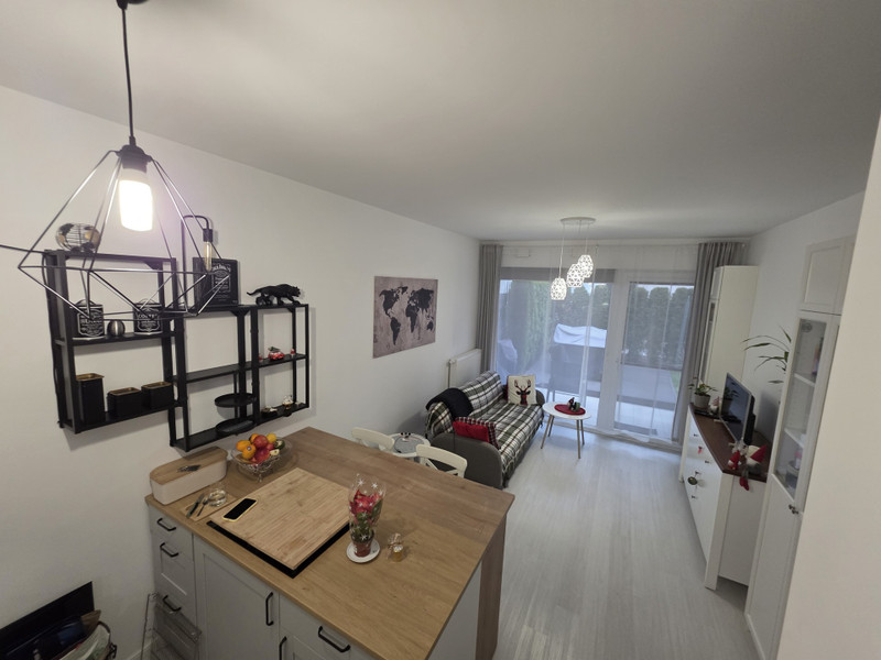 Mieszkanie znajduje się parterze, składa się z salonu z aneksem kuchennym, pokoju, łazienki z WC i holu o powierzchni użytkowej 39m2. Do mieszkania przynależy ogródek.