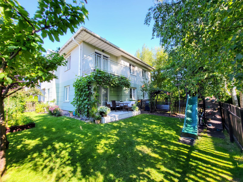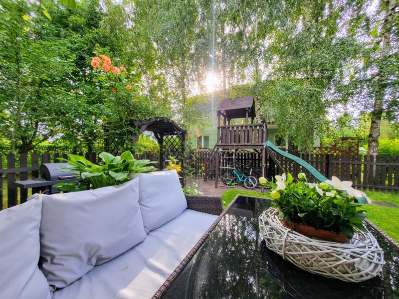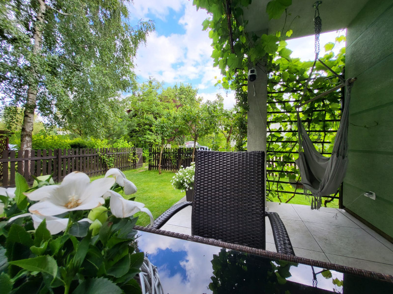• Duży, zadbany ogród z tarasem – idealne miejsce do wypoczynku, uprawy roślin i zabawy dla dzieci (znajduje się tam drewniany domek dla dzieci ze zjeżdżalnią, ścianką wspinaczkową, a w ogrodzie rosną winogrona, borówki, maliny, czereśnie, na tarasie meble ogrodowe).