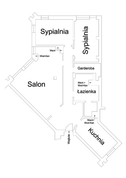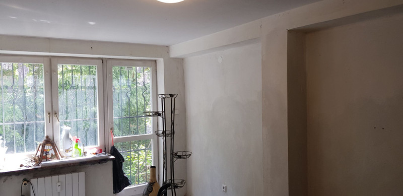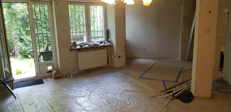 Obecnie stan bez mebli i tapet. Klepka podłogowa zdjęta razem z klejem, podłoga gotowa pod panele. Łazienka i kuchnia w oryginalnych kafelkach i z białą zabudową.