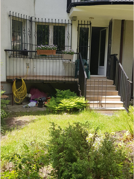 Salon z wyjściem na mały taras prowadzący do ogródka za blokiem. Sypialnie mają też widok na ogródek.