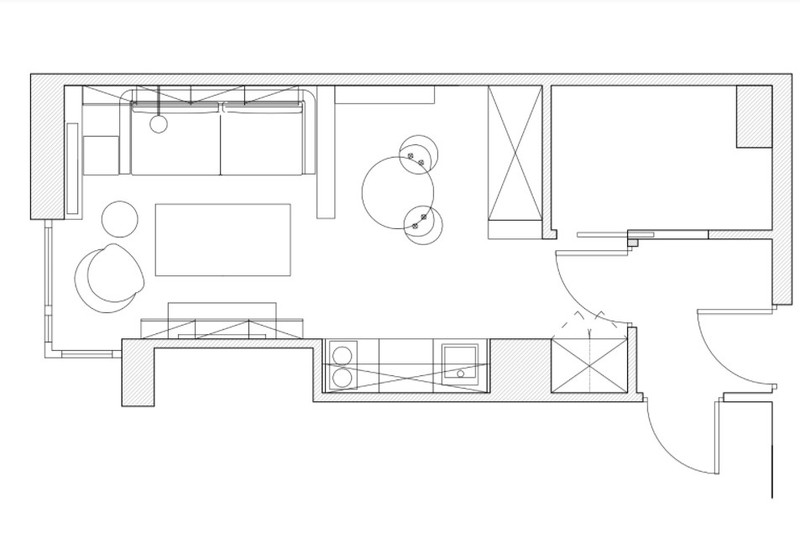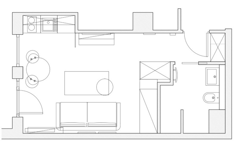 Mieszkanie podzielono na 2 lokale mieszkalne po 21m2. Każde z tych mikro-kawalerek ma jeden pokój swój aneks kuchenny, swoją łazienkę, osobne wejściem na klatkę schodową. DO całości przynależy jeden garaż.