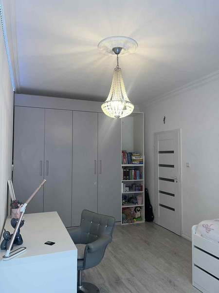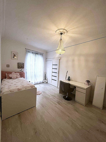 The apartment has a perfect layout – a large living room with an open kitchen and dining area, 3 bedrooms, a study (or additional room), a bathroom, a separate WC, a walk-in wardrobe, and a laundry room.