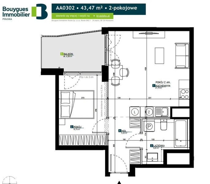 Niewątpliwym atutem samego mieszkania jest dogodny rozkład oraz wielkość pomieszczeń. Salon z aneksem to 22m2 (duży jak na 2 pokoje), daje możliwość ciekawego podziału stref: salonu i kuchni. W mieszkaniu znajduje się sporo miejsca na duże szafy w zabudowie. Zwłaszcza w holu i sypialni.