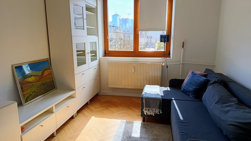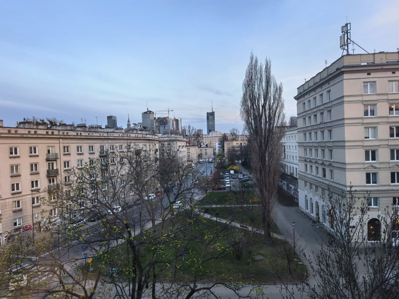 • salon z aneksem kuchennym (w pełni wyposażonym) – ok. 17,1m2; ok. 3m / 5,7m (widok na ul. Nowolipki - strona południowa)