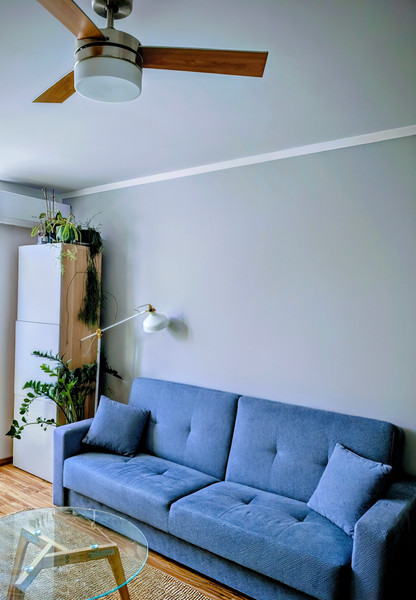 Idealny klimat: Ekspozycja wschodnia (słońce rano, przyjemny cień po południu) sprawia, że mieszkanie się nie przegrzewa. Dodatkowo zamontowana klimatyzacja oraz stylowy wiatrak sufitowy zapewniają komfort w każdą pogodę.