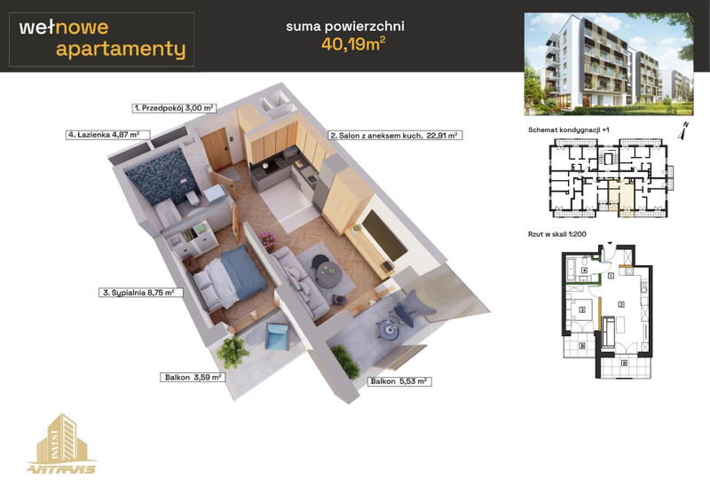 Apartamenty Wełnowe | 40,19 m² | 2 pokoje, 2 balkony, 3 piętro