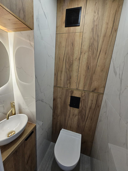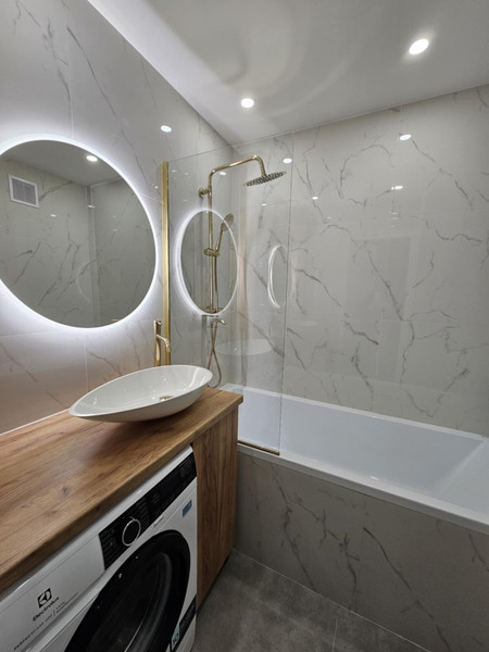 Łazienka / osobne wc: Pralka z nowoczesnym silnikiem interwałowym Elektrolux, szafka pod umywalke oraz nad geberitem wykonana przez stolarza. Deszczownica w zestawie ze słuchawka oraz bateria z wylewką (kran) - można brać prysznic jak w kabinie (zamontowany parawan aby uniknąć chlapania), albo posługując się wylewką przy baterii (kran) kąpiel w wannie. Nad umywalką lustro zapalane led. W osobnym wc nad geberitem szafka wykonana przez stolarza, dodatkowa umywalka i lustro.