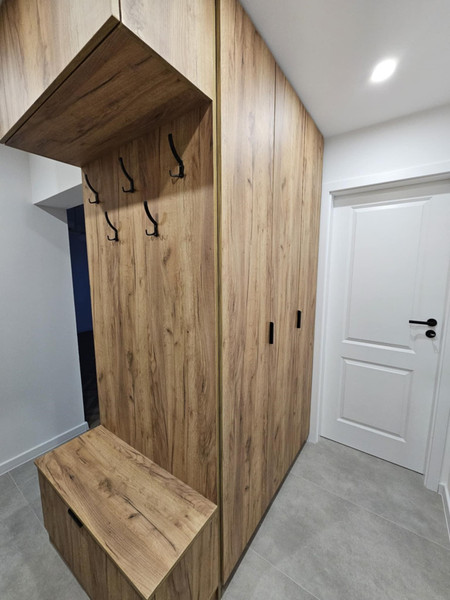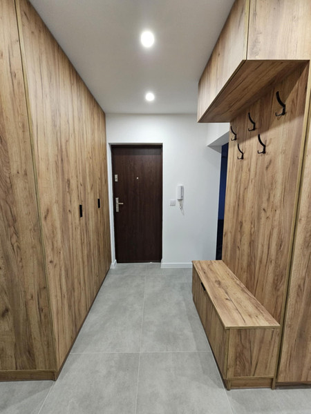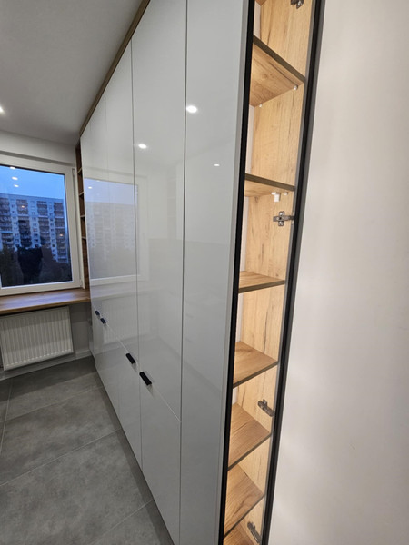 Przedpokój: Dwie szafy na wymiar pod sufit wykonane przez stolarza. Dodatkowo siedzisko z wieszakami. Nowe drzwi wejściowe, nowoczesne drzwi do łazienki, wc, pokoju oraz sypialni, schowku. Na podłodze gres.