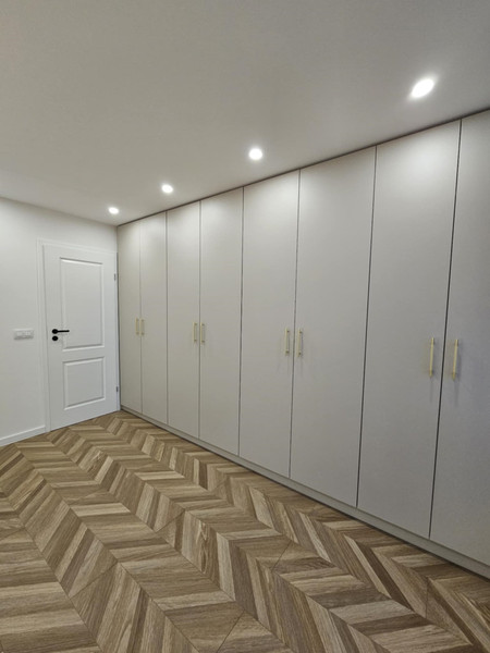 Mały pokój: Szafa kaszmir wykonana przez stolarza. Wypuszczone przewody tv/internet. Panele w nowoczesnym stylu "jodełka".