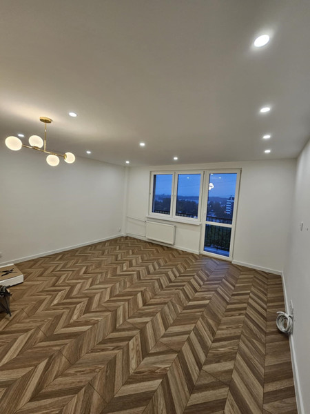 Salon: Duży salon z balkonem, przystosowana ściana pod tv (system podtynkowy pod kable oraz umocowanie tv na ścianie, wypuszczone przewody tv/internet), naprzeciwko okien zwis pod stół. Panele na podłodze w nowoczesnym stylu "jodełka".